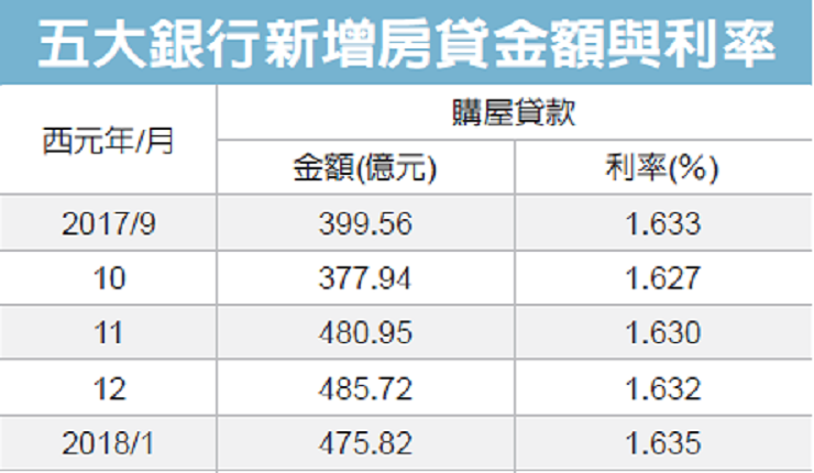 央行資料顯示,9月台灣銀行、土地銀行、合作金庫、第一銀行與華南銀行等五大銀行,合計新增房貸386.8億元,為兩個月高點,並較8月增加18.3億元。