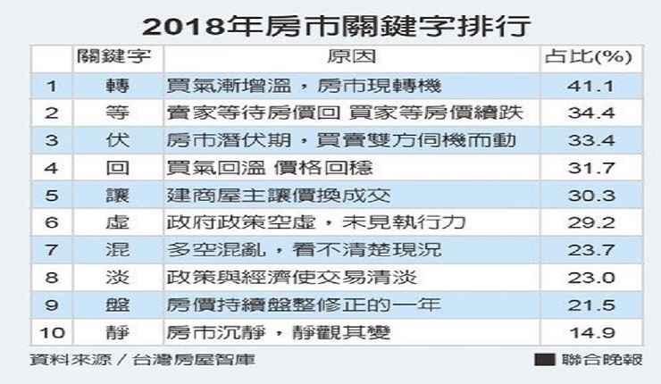 台灣房屋舉辦2018年房市代表字票選結果出爐,「轉」字獲得最高票,其次為等、伏、回。房市十大有感新聞由「實價登錄2.0交易揭露更即時」拿下第一,其次為娃娃機熱潮、租賃專法上路。