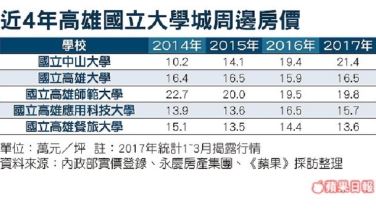永慶房產集團統計高雄市中山大、高應大、高師範、高雄餐旅與高雄大學5大國立大學城區段房價,近4年房價漲幅最多的是西子灣風景區旁中山大學,每坪均價從2014年10.2萬元,至今年每坪21.4萬元,成長109%。