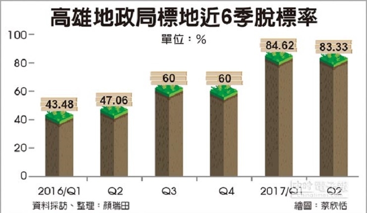 高雄地政局此次土地標售,再度顯示高雄房地產有觸底回升的跡象,因為,近年的低迷,導致105年第一季的脫標率達到近年的低點43.48%,此後,即一路回升,今年第一季脫標率達84.62%,這次的脫標率也維持高檔的83.33%。