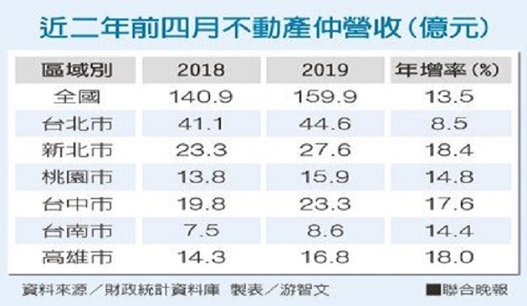 在不動產仲介業營收方面,根據財政部統計資料庫,今年前四月全國仲介業營收約160億元,較去年同期增加13.5%、19億元,為2015年以來新高,六都除了北市年增8.5%,少於一成外,其他增幅都在一成以上,新北、高雄都成長18%。