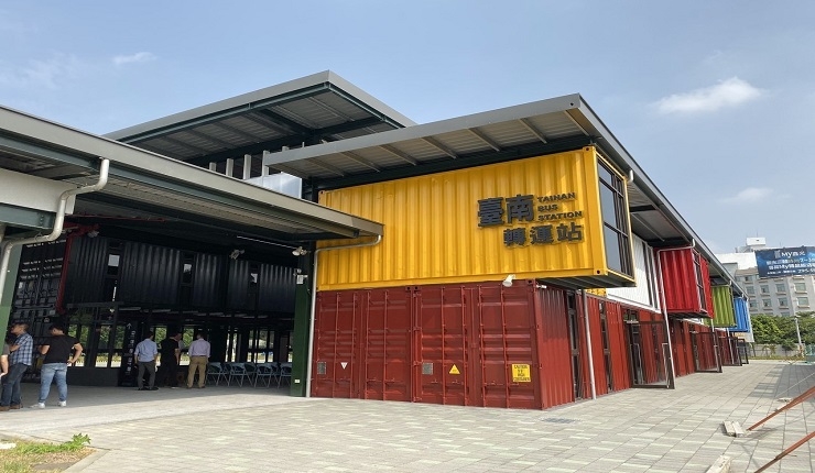 座落在台南市北區的台南轉運站,占地2.6公頃,由九穗聯合建築師事務所建築師吳瑞龍設計,去年3月5日動工,以綠建材及可回收鋼構、貨櫃作為主體構造,東西兩側共使用64個20呎貨櫃堆疊,創造出候車、售票、商業及業者辦公等空間,兩排貨櫃間的挑高中庭是候車廣場,充分發揮轉乘接駁效能。