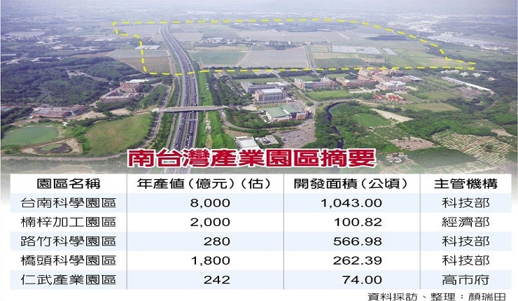 南科投資組科長曾旭廷表示,台南科園區開發面積1,043公頃,2018年產值約7,511.88億元,2019年前10個月約5,725.79億元,路竹科2018全年產值約289.36億元,2019年前10個月約237.95億元。