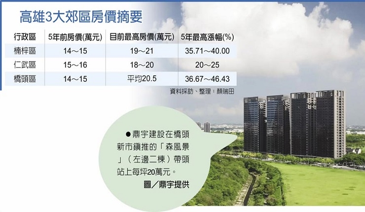 林聰麟指出,至於郊區的楠梓區高雄大學生活圈,五年前房價,每坪平均售價大約14到15萬元,在全誠建設「遠見峰悅」的引領下,每坪開價介於19萬到21萬元;仁武區五年前大約介於15到16萬元,全誠和城揚合作的「可麗都」,每坪售價已上漲到18到20萬元。