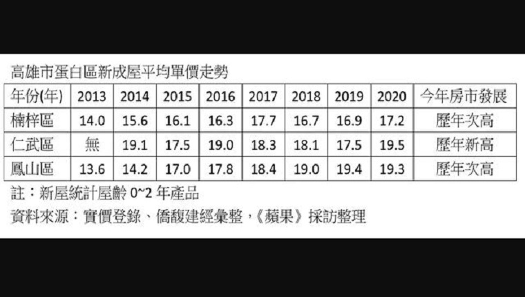 今年全台因武漢肺炎疫情影響,房市交易結算至7月各區成交均出現下滑,然而央行出手降息讓房貸利率調至歷史新低,也讓不少首購族更願意出手置產。《蘋果新聞網》委託僑馥建經統計,高雄3大蛋白區新成屋房價走勢,仁武今年新屋成交均價創歷史新高,鳳山與楠梓則創歷年次高,且3大區域均朝向全面2字頭房價!專家分析,各項成本提高,購屋族越晚買房價越貴,居住空間越小。
