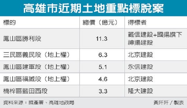 高雄市12月來有多筆公部門釋出土地標脫,包括國產署14日的地上權標售狀況中,吸引上櫃建商永信建設,以及高雄推案積極的北京建設搶進,共有五筆高雄市地上權標脫。隨即16日高雄地政局土地標售,除國揚集團和藏信建設聯手獵地,隆大也以每坪51.8萬元,取得高雄大學生活圈641坪土地。