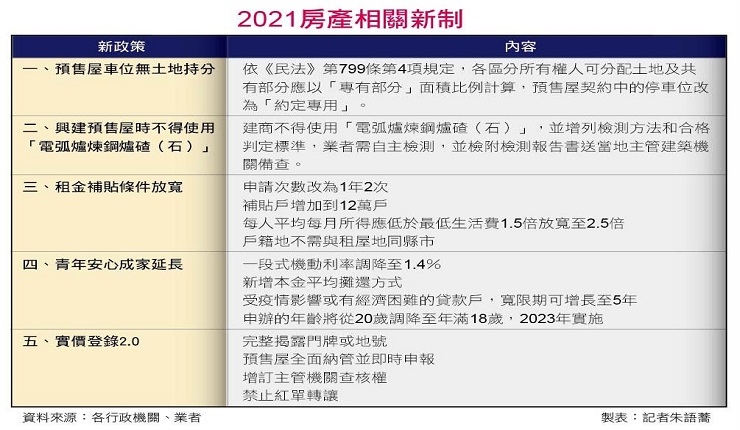 政府政策常影響房地產走向,央行在上月底無預警出手「打炒房」,加強不動產信用管制,讓市場掀起波瀾,今年還有哪些新制已上路或即將上路?與房地產相關的,包括「預售屋買賣定型化契約應記載及不得記載事項」部分規定修正草案,今年開始,預售屋停車位不再配分土地持分,契約未符合條件者最高可罰50萬元。