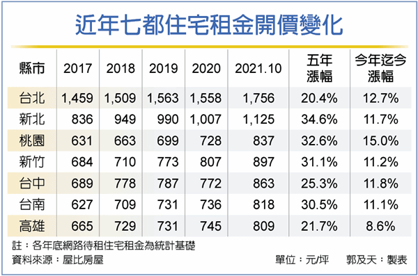 不僅租屋需求強的台北市租金高漲,近年房市熱絡的其他都會區租金上漲幅度更可觀,新北、桃園、新竹、台南等地,五年來租金漲幅均達三成以上。新北市自去年突破每坪千元大關後,目前租金開價達每坪1,125元,過去租金基期低的雙北以外都會,五年前每坪租金僅不到700元,如今全面站上每坪800元,高所得人口結構、房價飆漲的新竹,更已逼近每坪900元,成為雙北以外租金最高的都會區。