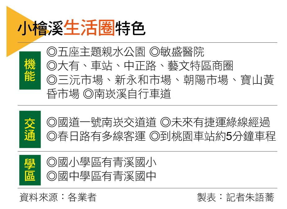 桃園小檜溪重劃區緊鄰桃園舊市區,以水岸住宅作規劃,被稱為桃園區最後一塊大型重劃區塊,吸引許多指標建商進駐推案,今年房價已進逼4字頭大關,主要以周邊區域客為主。