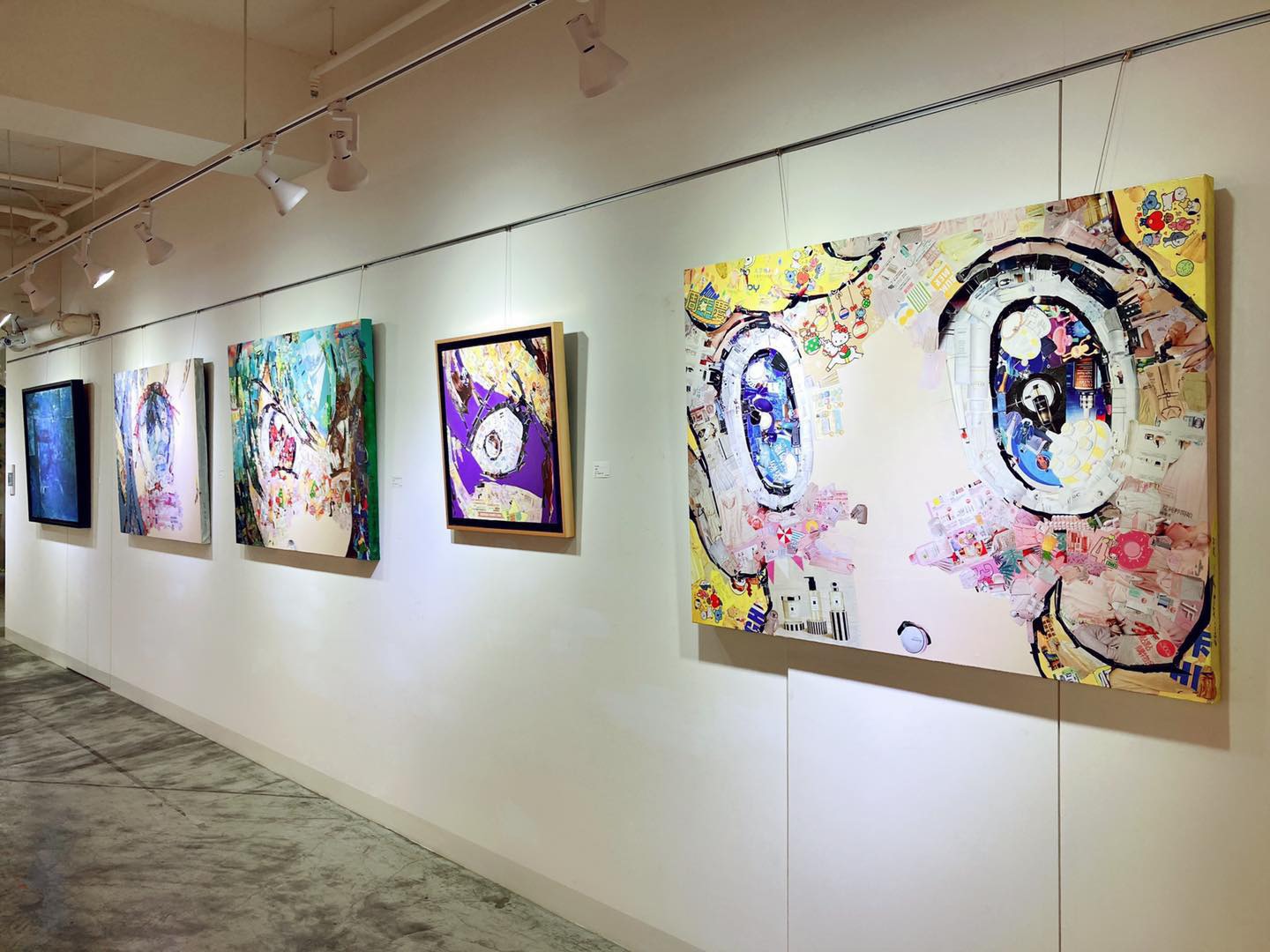 范峻銘,以時尚雜誌圖片拼貼動漫人物眼睛,呈現出物質炸裂般的綴錦貼圖,轉譯網路時代人與人之間的 情感溝通模式。