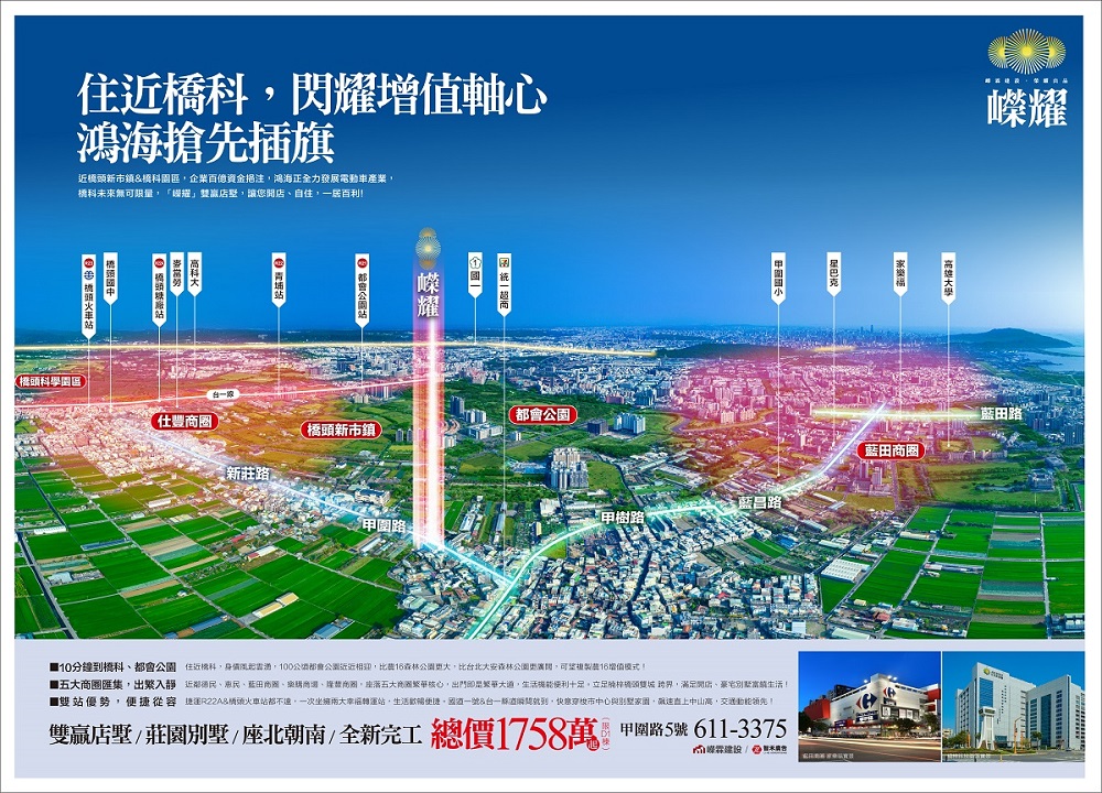 「嶸耀」近鄰橋頭新市鎮與「橋科園區」,企業百億資金挹注,鴻海已搶先插旗,是北高雄最閃耀的增值軸心!鴻海正全力發展電動車產業,相關產業鏈已形成,橋科未來無可限量。「嶸耀」雙贏店墅,不論是開店、自住,一居百利,現在即時收藏,未來倍數增漲!