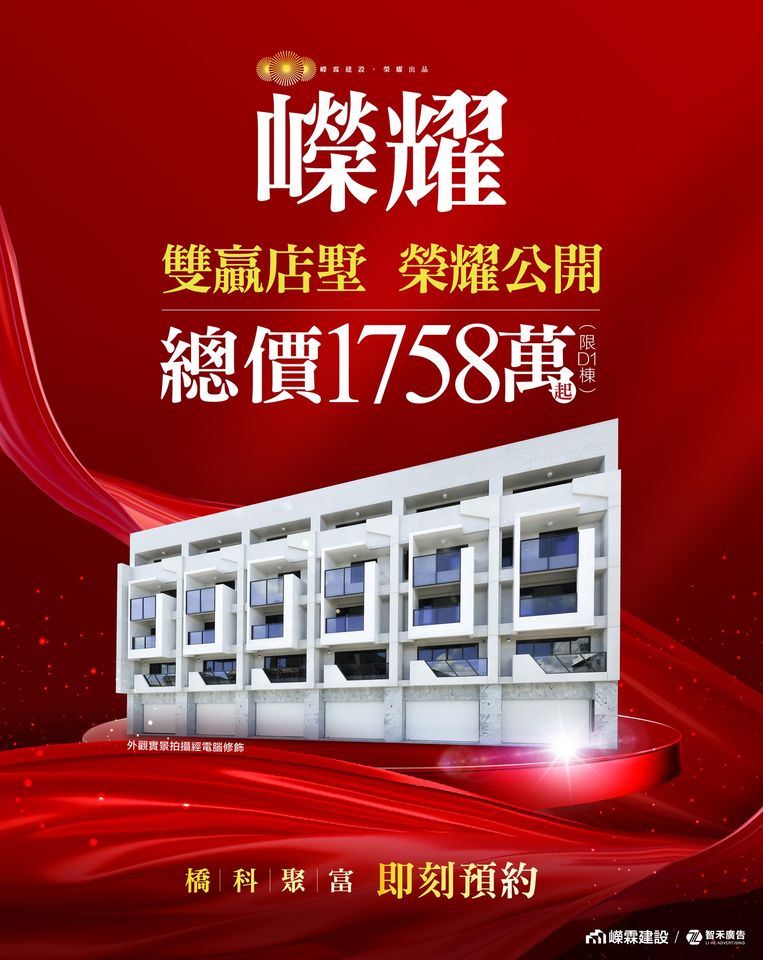 「嶸耀」座北朝南,帝王座向,大道開店風雲聚富,退一步是莊園別墅,尊榮15席,大砌珍稀。建築外觀承襲「嶸霖建設」一貫優雅的白派美學,立面設計展現時尚大砌、幾何框架全新風格,讓別墅更具現代立體感,完美呼應「橋頭新市鎮」未來城市風格!