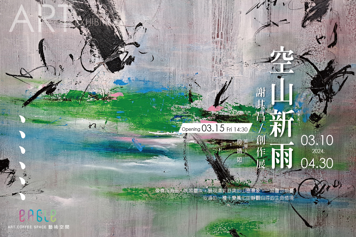 「空山新雨-謝其昌創作展」 3月10日至4月30日於高雄雄崗美術館展出,25件抽象藝術創作,像春雨過後,洗滌塵埃,展現清新舒爽的山巒景象,一掃塵世煩憂,安適於一種千變萬化卻靜觀自得的生命情境。3月15日(星期五)上午14:30舉行開幕儀式,歡迎蒞臨觀賞。