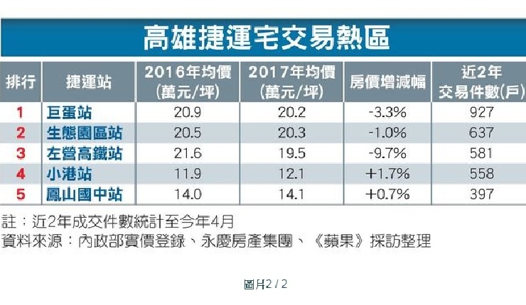 統計高雄最熱門捷運宅前5名分別是捷運巨蛋、生態園區、左營高鐵、小港與鳳山國中站,其中又以捷運巨蛋站最熱門,去年至今已成交927件,成交均價每坪20~21萬元。