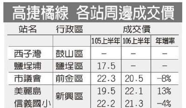 莊志成表示,同區漲跌互見的情況,在高雄捷運橘線新興區的美麗島站及信義國小站也出現,美麗島站房價年漲13%,但下一站信義國小站卻下滑4%,苓雅區四個站也依站別不同,年增率變化也在-3%至14%之間。