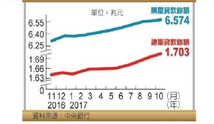 中央銀行昨(27)日公布,10月全體房貸餘額達6兆5,743億元、建築貸款餘額1兆7,033億元,雙雙續創歷史新高紀錄,但年增幅皆較上月下滑,主因與10月交易量減少有關。