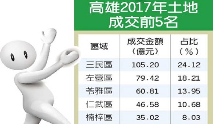 國內建商去年前進高雄卯起來買地,共買進13.66萬坪土地、成交總價463.1億元,比2016年的318.01億大增45.62%;交易熱區第一名是三民區的105億,占比達24.12%。