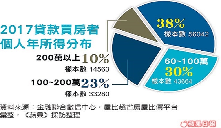 【崔雅慧╱台北報導】聯合徵信中心的房貸資料顯示,去年申請貸款者有38%的年收入未滿60萬元,是佔比最高的族群,加上第二高的年收入60~100萬佔30%,顯示房市買氣有68%靠的是百萬年薪以下的年輕首購族支撐。