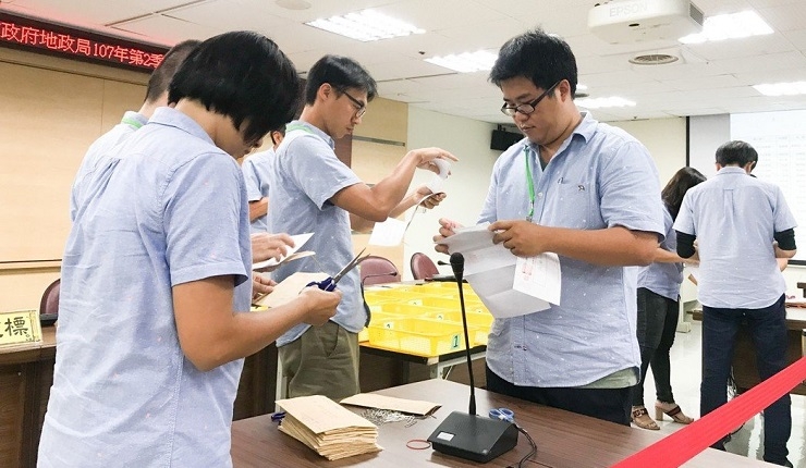 雖然高雄大雨滂沱,但地政局開標會議室等待開標的房地產同業,不畏風雨,會議室內外滿滿人潮擠得水洩不通,高雄土地交投熱絡由此可見一斑。