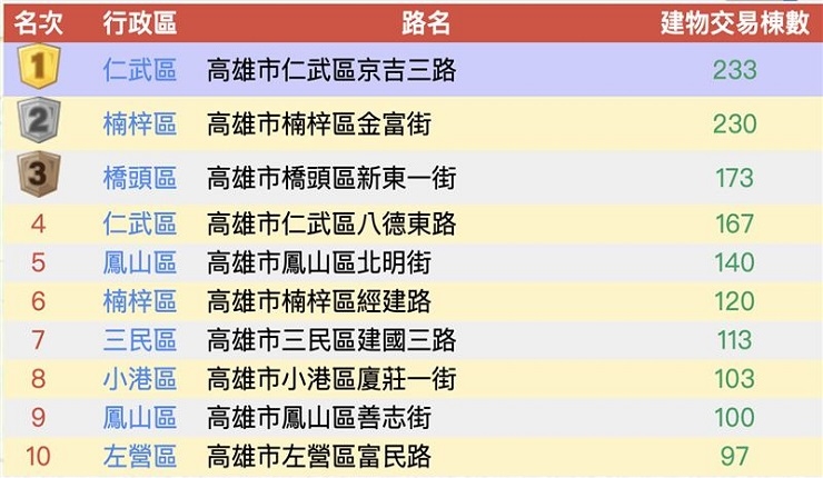 高雄市蛋白區如楠梓、仁武與鳳山新屋房價均創新高或歷年次高。