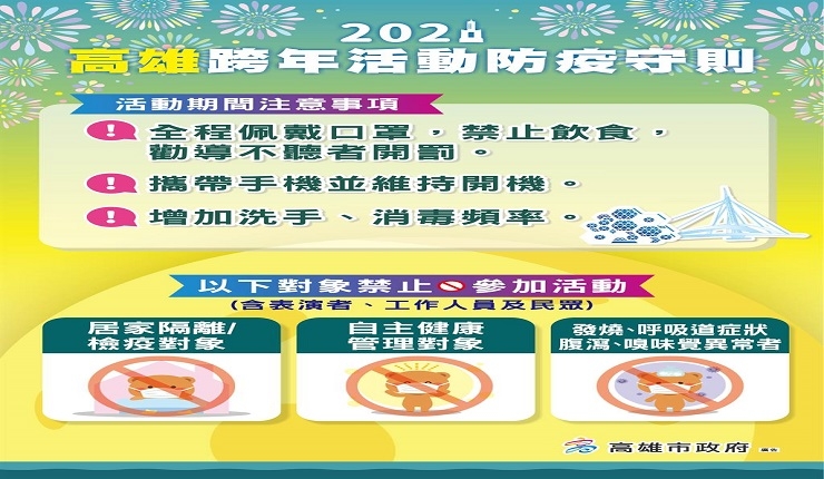 高雄市COVID-19流行疫情指揮中心副指揮官黃志中局長進一步說明,高雄市相當重視防疫工作,特別是此大型跨年活動更應謹慎沙盤推演各種可能的風險,並於事先做好規劃,因此,市府跨局處防疫團隊於日前已針對此跨年活動召開過多次籌備會議,並依據中央流行疫情指揮中心與各地方政府召開共識會議之「跨年晚會活動防疫原則」及「COVID-19(武漢肺炎)」公眾集會指引,擬定高雄市跨年晚會防疫措施,底定重點防疫工作,在事前宣導方面:民政及警政單位針對居家檢疫及自主健康管理對象加強提醒禁止參加跨年活動,並運用各項宣導管道向民眾宣導參加跨年活動應全程戴口罩、禁止飲食、民眾於自主健康管理期間不能參加跨年活動等規定;於活動會場:利用晚會會場的廣告破口時段,由主持人提醒所有現場民眾戴口罩、現場設置大型海報看板、走動式舉牌提醒民眾戴口罩、員警及防疫人員劃分責任區域執行定點及不定點走動式稽查「嚴禁參加民眾脫口罩及於會場內飲食」;成立「快速反應隊」由民、警政當日抽查居家檢疫民眾是否違規外出,會場內定點及不定點走動式稽查,經勸導仍堅持不戴口罩或堅持飲食者,帶離現場並由衛生局依法裁罰;此外,活動會場定點提供酒精、乾洗手液等防疫消毒用品供民眾使用並要求業者流動廁所應增加清消頻次。活動後追蹤:活動後三週內,如有疑似症狀者,將以手機回溯調查。針對前述各項規劃,市府相關局處團隊將於本週赴會場實地演練,希望全體市民務必配合市府防疫政策共同快樂健康迎向2021年。