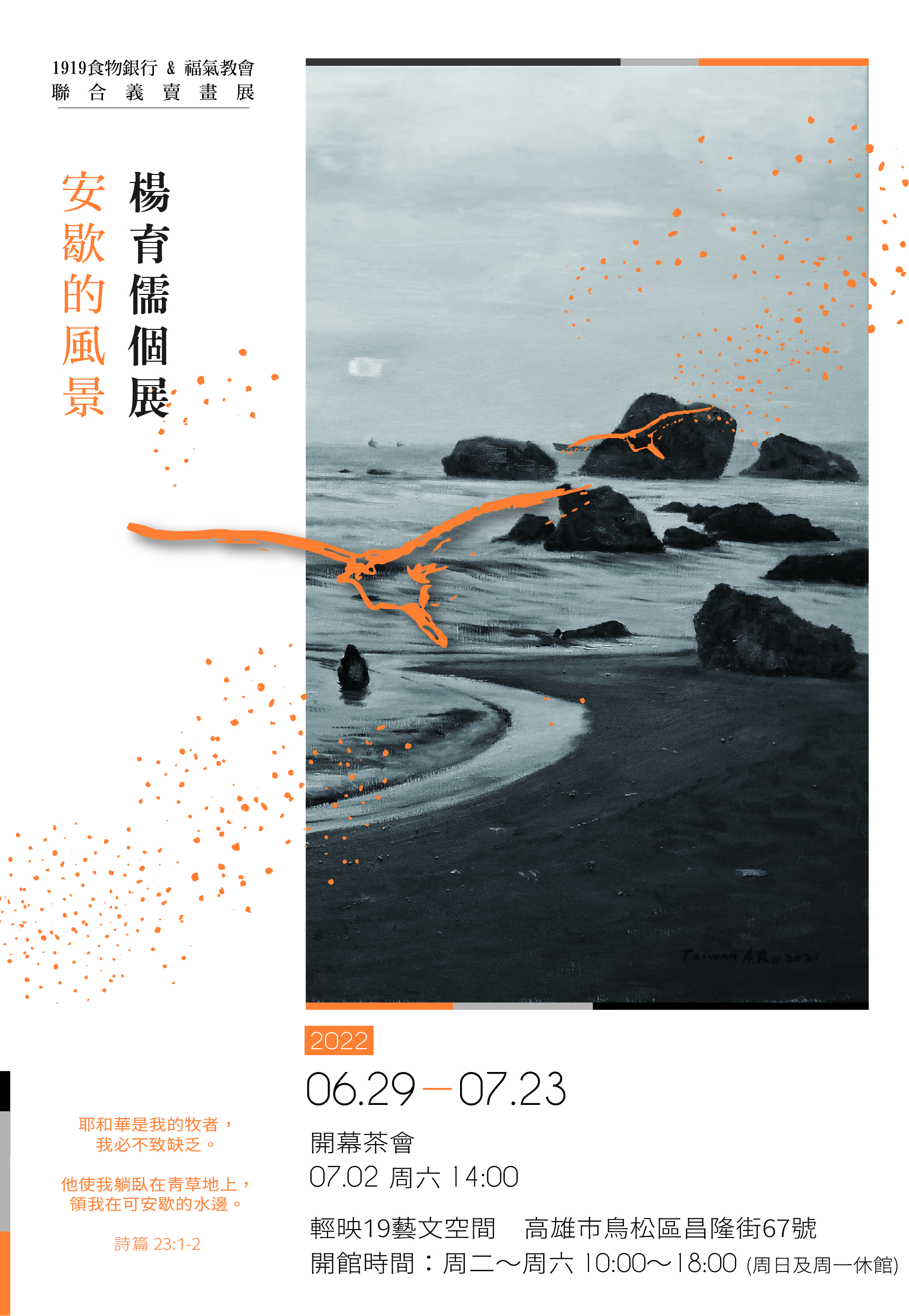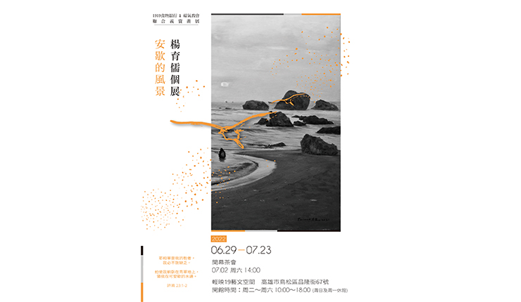 1919食物銀行與福氣教會的聯合義賣畫展「楊育儒個展」,展出地點為「輕映19藝文空間」地址是:高雄市鳥松區昌隆街67號,展出期間為6/29~7/23上午10:00至下午18:00 (周日、周一休館),開幕茶會訂為7/2(六)下午14:00。願所有喜愛藝術或有能力扶危濟困的人士,前往賞畫、共襄盛舉!
