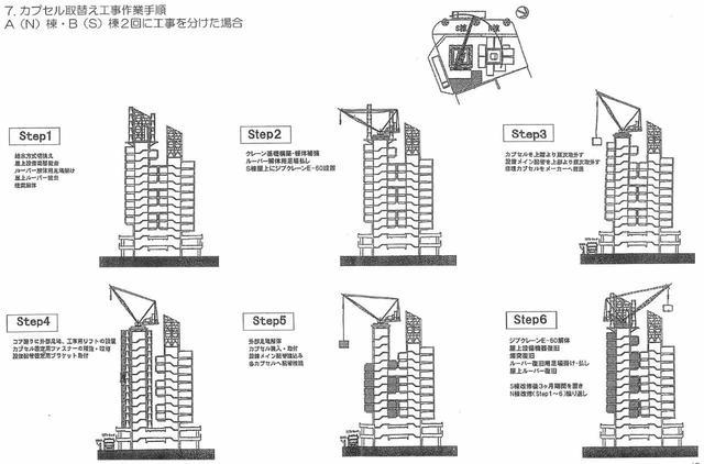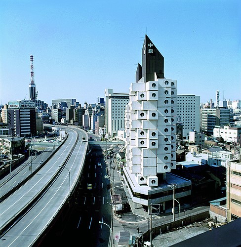 被認定是現代建築史上第一座真正以膠囊方塊般的建築模塊興建而成大樓,在1972年(昭和47年)完工,位在日本東京最繁榮擁擠的銀座,以代謝再生的思惟,意圖創造能夠重組重生的建築型態,所以將建築上140個居住單元採取在工廠就完工的預鑄膠囊化,每個膠囊裡都配有居家的基本配備,包括床舖、衛浴、電視、音響、電話及書桌等,滿足居住者的基本需求,最後再以吊掛的方式將所有膠囊組合成一棟真正大型的建築物。